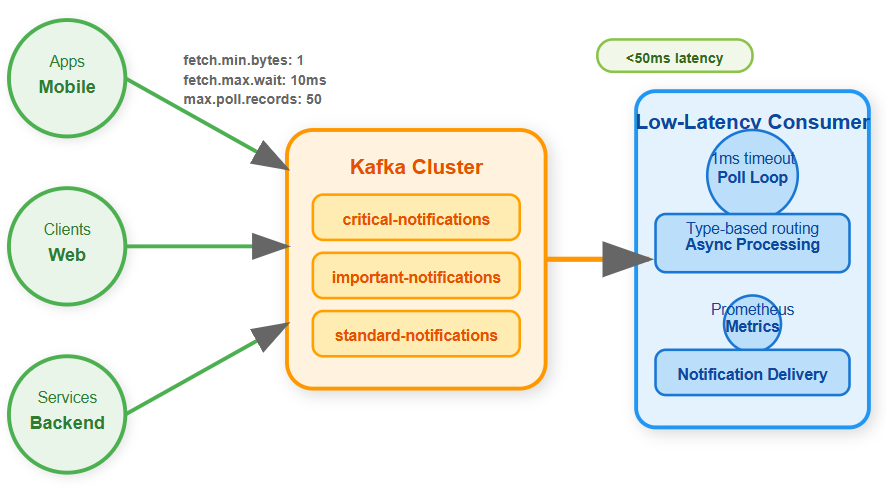 fetch.min.bytes: Minimum data before returning (we’ll use 1 byte - don’t wait!)fetch.max.wait.ms: Maximum wait time for batching (we’ll use 10ms - barely any wait!)