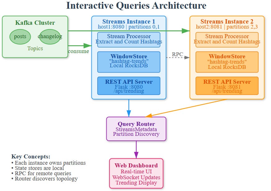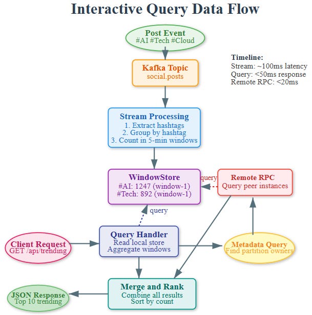 The tricky part: your state is partitioned. If you have 3 application instances, each owns 1/3 of the partitions. A query for “all trending topics” needs to: